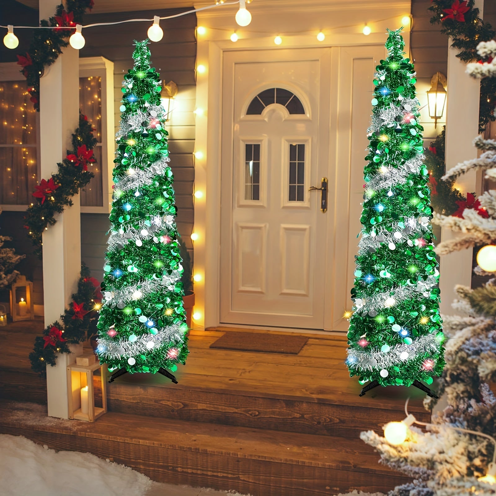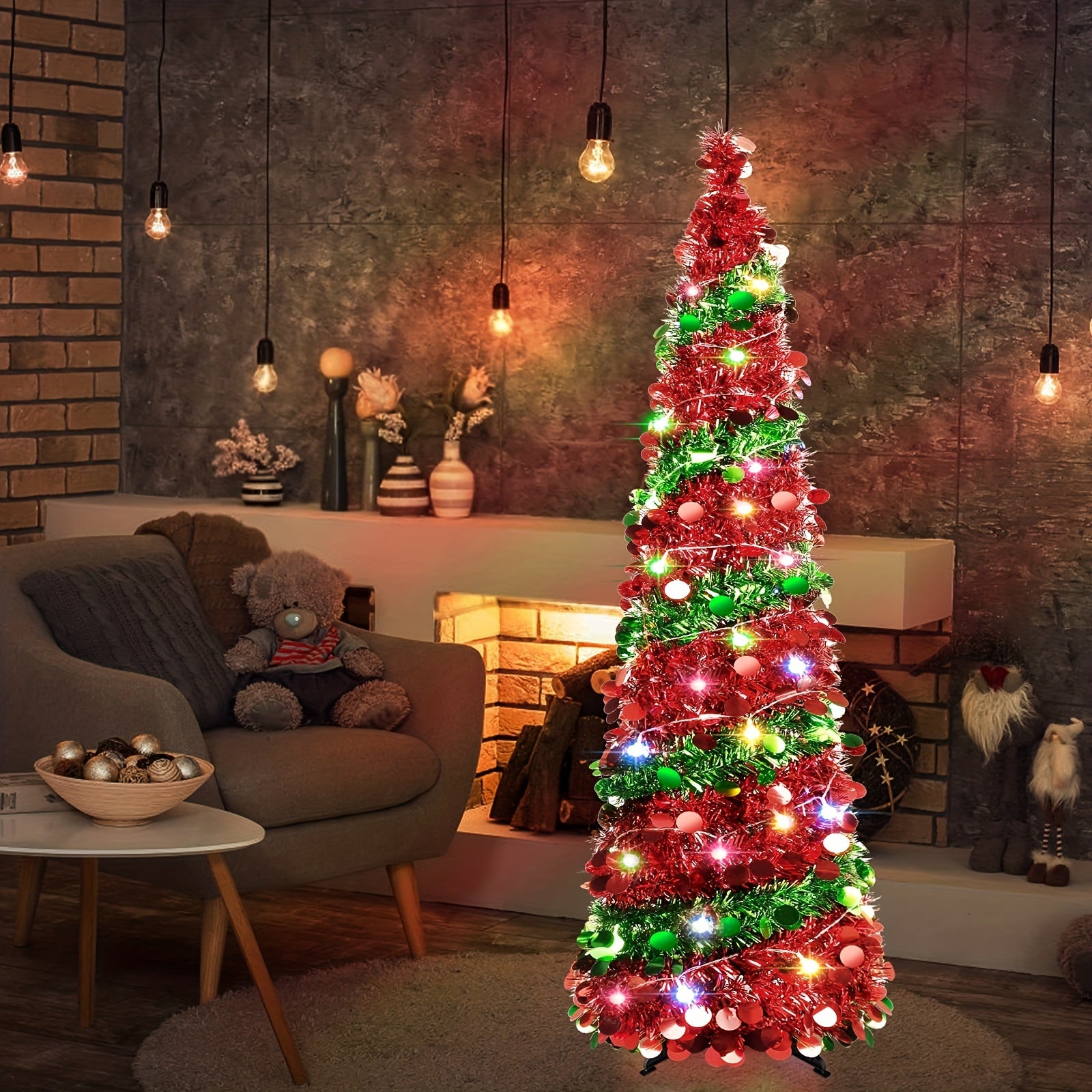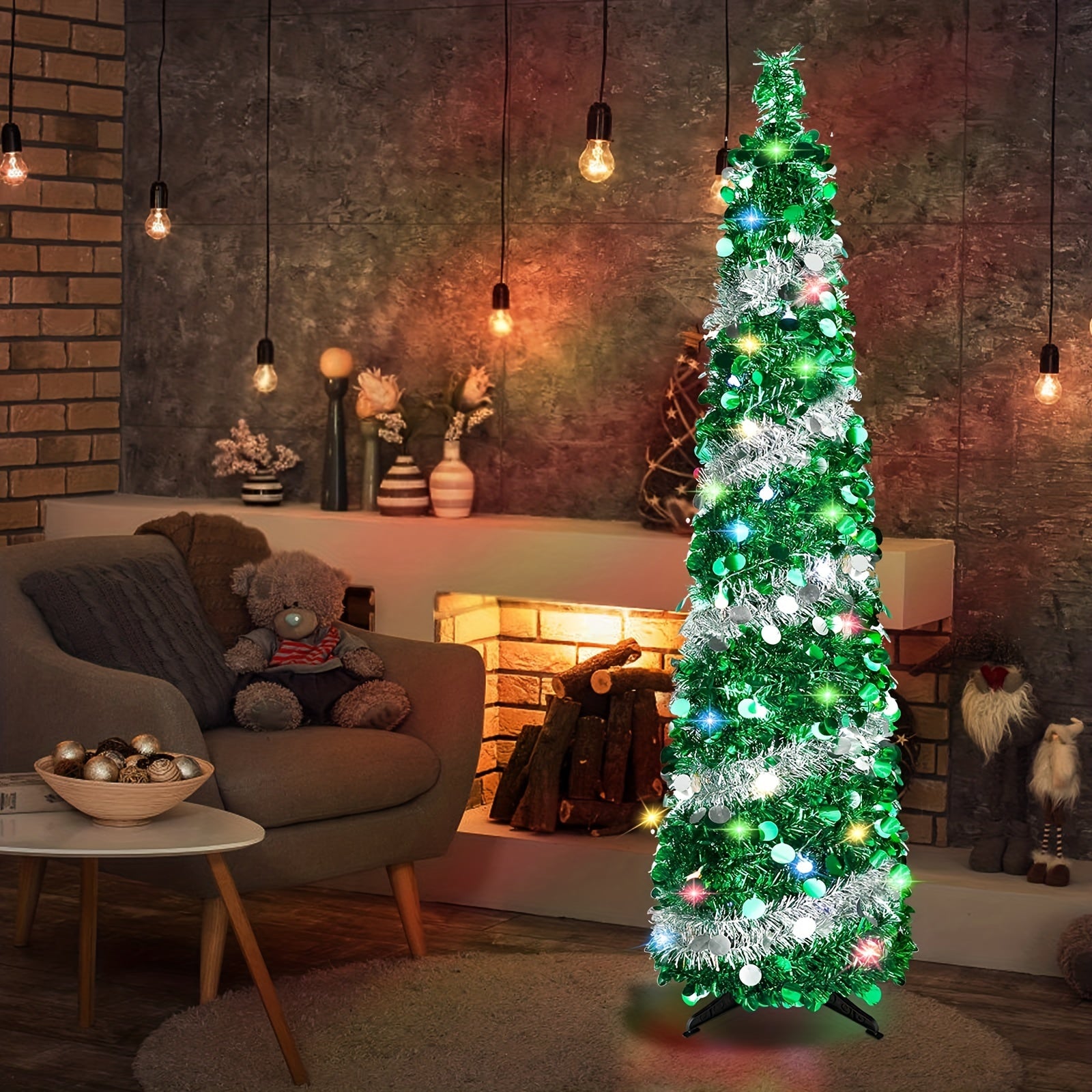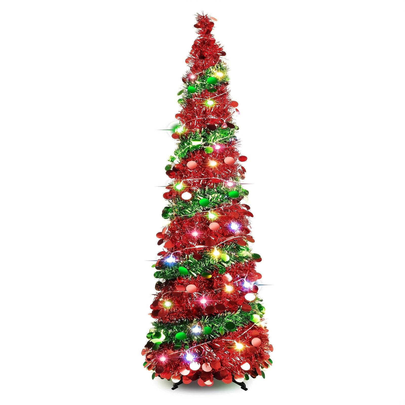 1pc, 5FT/1.5M Christmas Trees With 90 Colorful Lights, Collapsible Artificial Sequin Pop Up Christmas Tree, Tall Skinny Pencil Tinsel Christmas Trees Xmas Tree For Home Apartment Basement Fireplace