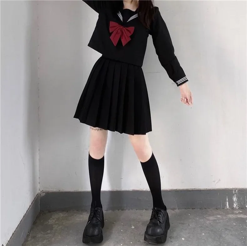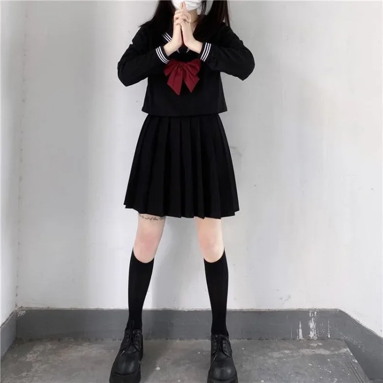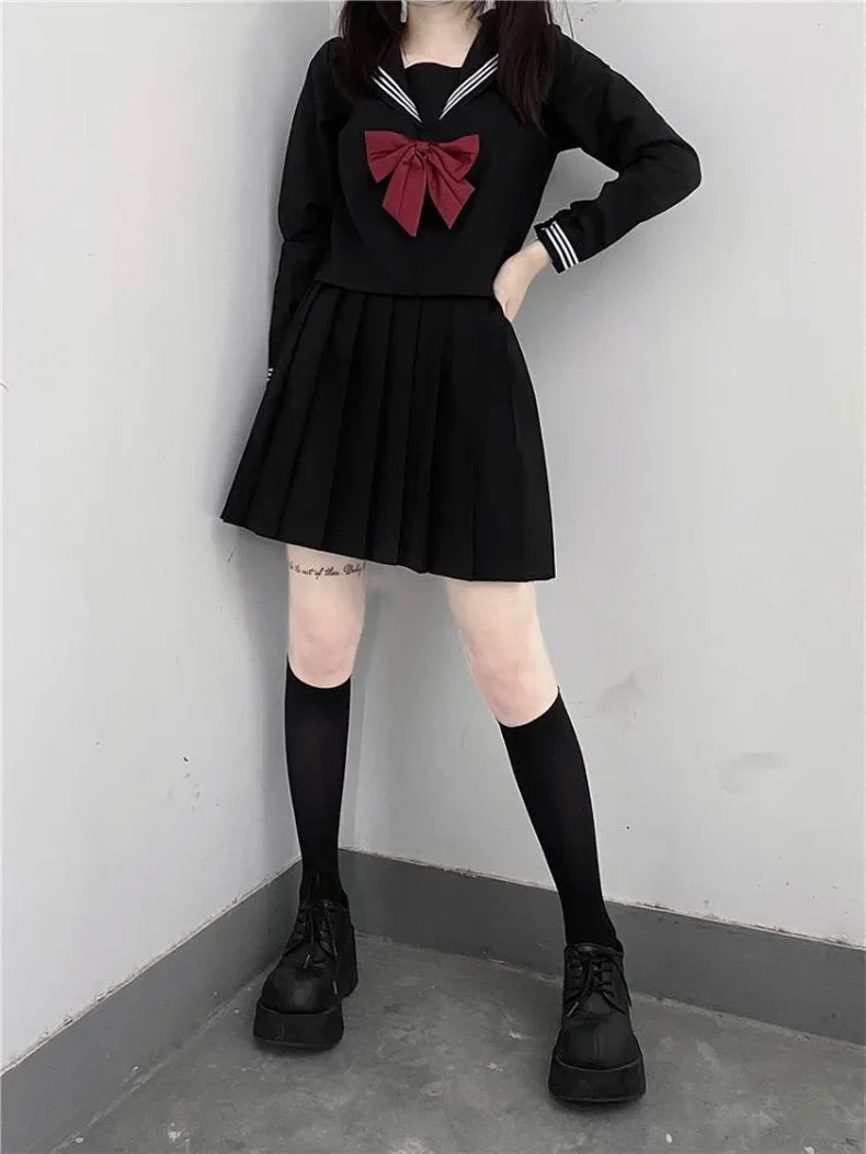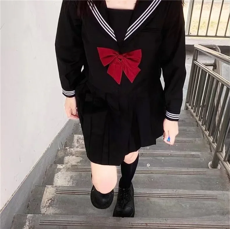 2025 Japanese School Uniform Girls Jk Suit Red Tie Black Oversized Patchwork Basic Sailor Uniform Women Long Sleeve Suit