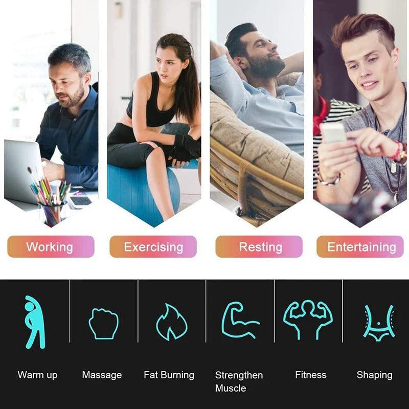 【EMS Technology】Electrical Muscle Stimulation through current stimulation, directly send signal to muscles, and promote muscle movement. All you have to do is to fit the pads to your body and let them exercise your muscles.Then promote muscles training and movement. Help to enjoy the healthy fitness