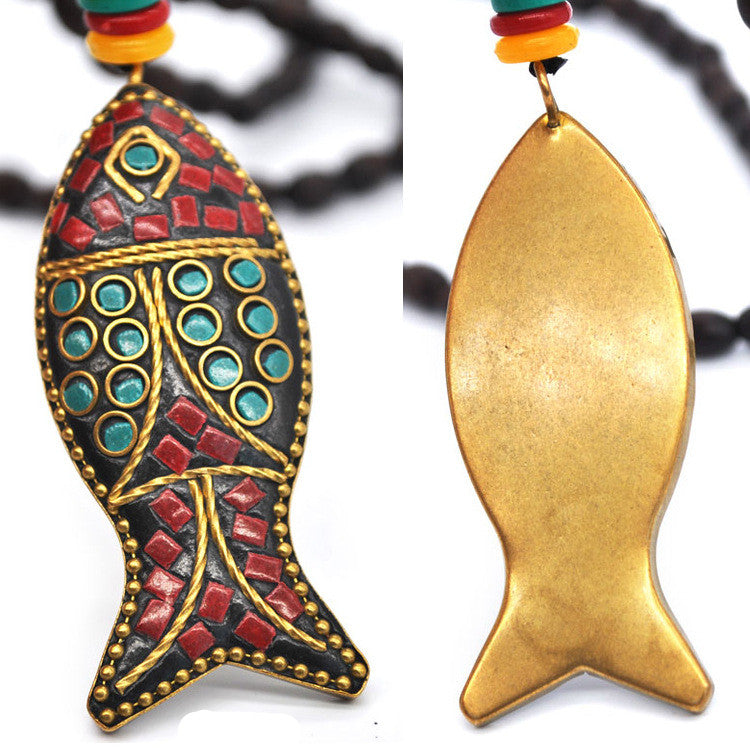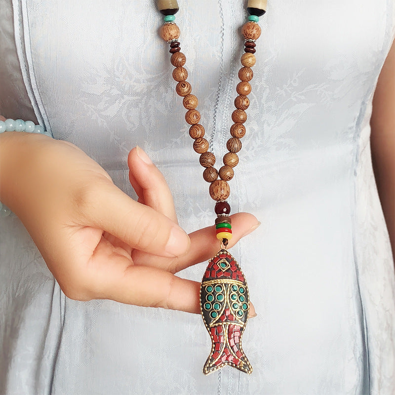 Product name: Wooden bead sweater chain small fish necklace women's national style long section literary forest series